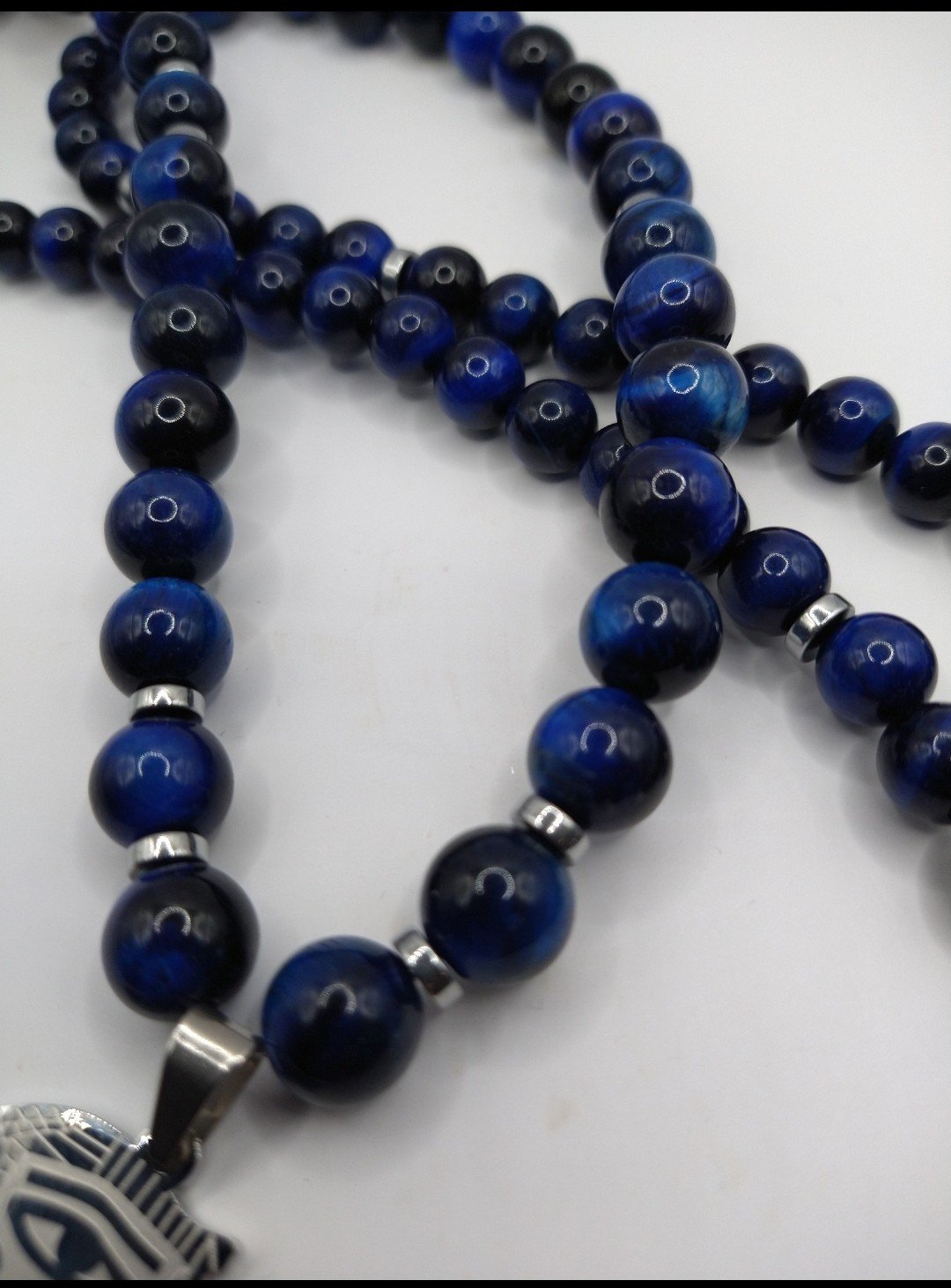 Materials: Genuine Blue Tiger’s Eye, Stainless Steel Africa pendant engraved with Eye of Horus