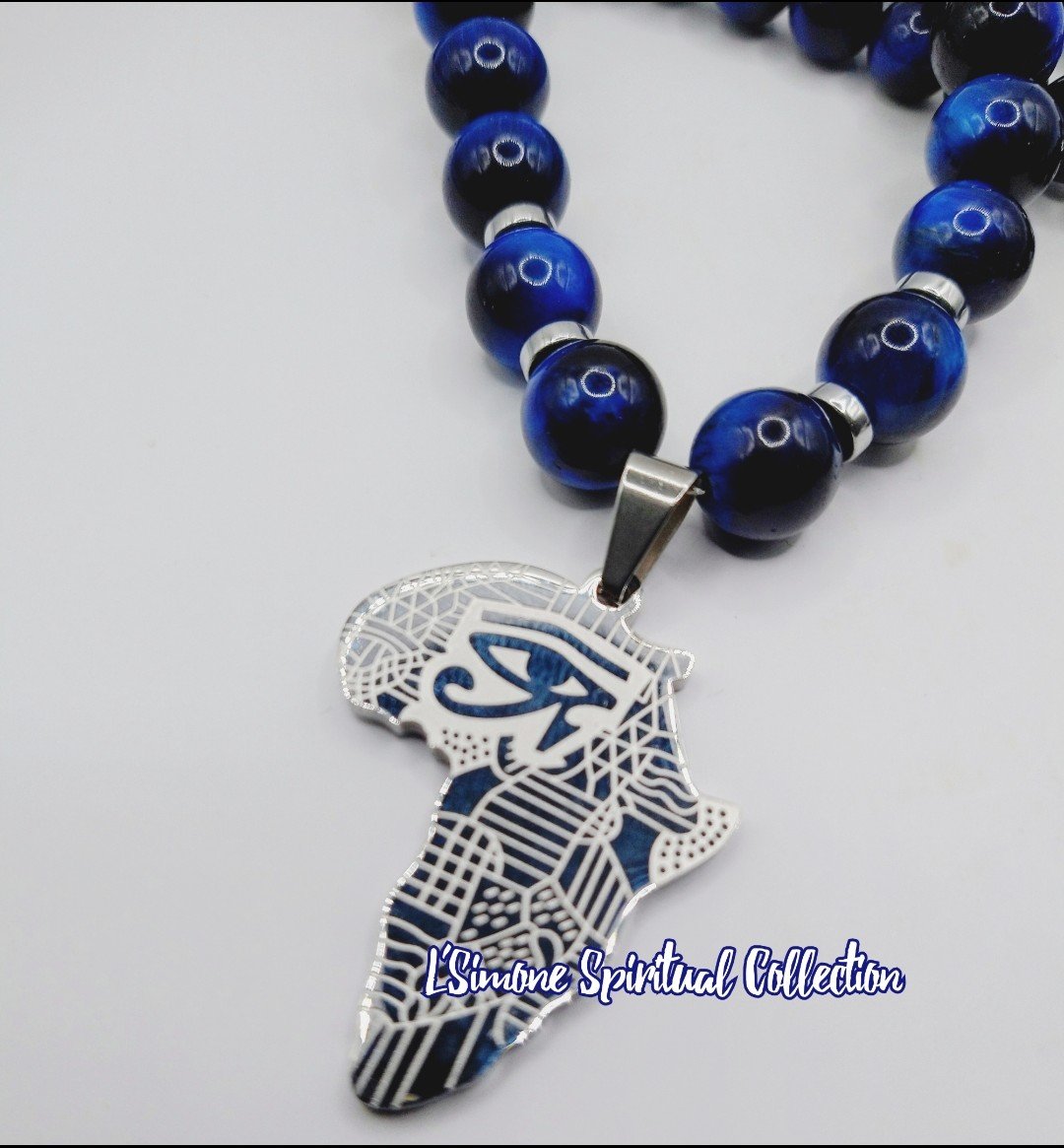 The necklace is finished with a silver Africa pendant engraved with the Eye of Horus, symbolizing divine protection, wisdom, and the power of clear sight. This combination of stone and symbol creates a powerful talisman to wear daily.